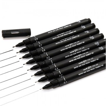 Fieltro de punta calibrado del otro gran fabricante japonés Uni-Ball. El pin Uni tiene una punta más firme que el Sakura Pigma Micron para líneas permanentes, limpias y precisas. Aquí disponible individualmente