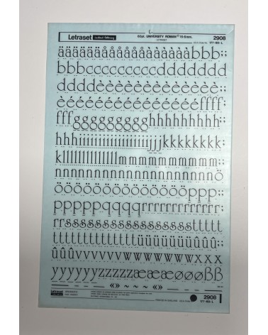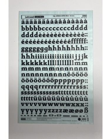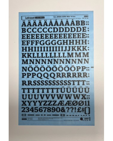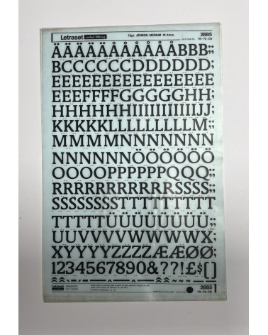 letraset-2885-JENSON MEDIUM-72pt : Letraset was a company known for manufacturing sheets of typefaces and other artwork elements using the dry-transfert lettering method. This dry rub down transfer technique was used by the punk movement because of its ease of manipulation and quality of the rendered layout. They could create designs independent from printers and publishers.