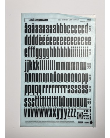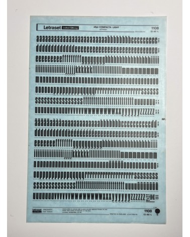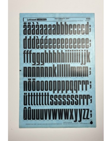 letraset-1095- COMPACTA LIGHT - 144pt : Letraset was a company known for manufacturing sheets of typefaces and other artwork elements using the dry-transfert lettering method. This dry rub down transfer technique was used by the punk movement because of its ease of manipulation and quality of the rendered layout. They could create designs independent from printers and publishers.