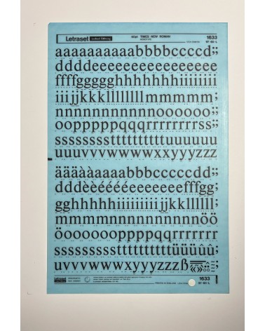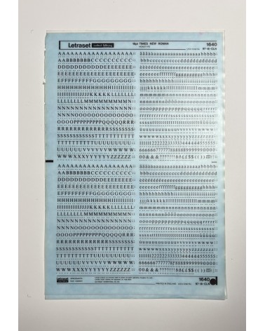 letraset-1633- TIMES NEW ROMAN - 60pt : Letraset was a company known for manufacturing sheets of typefaces and other artwork elements using the dry-transfert lettering method. This dry rub down transfer technique was used by the punk movement because of its ease of manipulation and quality of the rendered layout. They could create designs independent from printers and publishers.