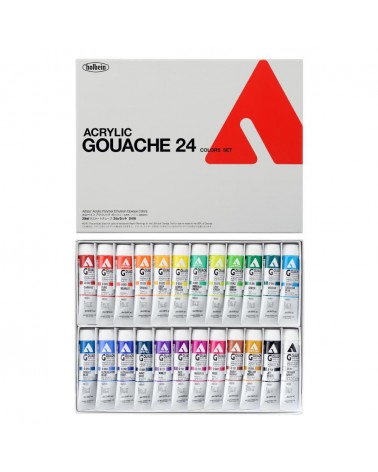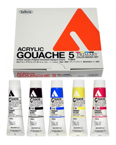Set of 5 Primary colors Acryla gouache 20ml Holbein : Holbein Acrylic Gouache is an opaque and highly-pigmented paint which dries to a velvety matte finish. In terms of handling and mixing, it behaves like traditional Gum Arabic gouache, but because it is made with an acrylic resin binder, it is water-resistant once dry. It dries quickly and with minimal colour shift; what you see wet is what you get once the paint has dried. Holbein Acrylic Gouache does not have the same fragile surface as traditional gouache made with Gum Arabic because the acrylic paint film is more flexible. It can be mixed with other acrylic or traditional gouaches, as well as with watercolours.