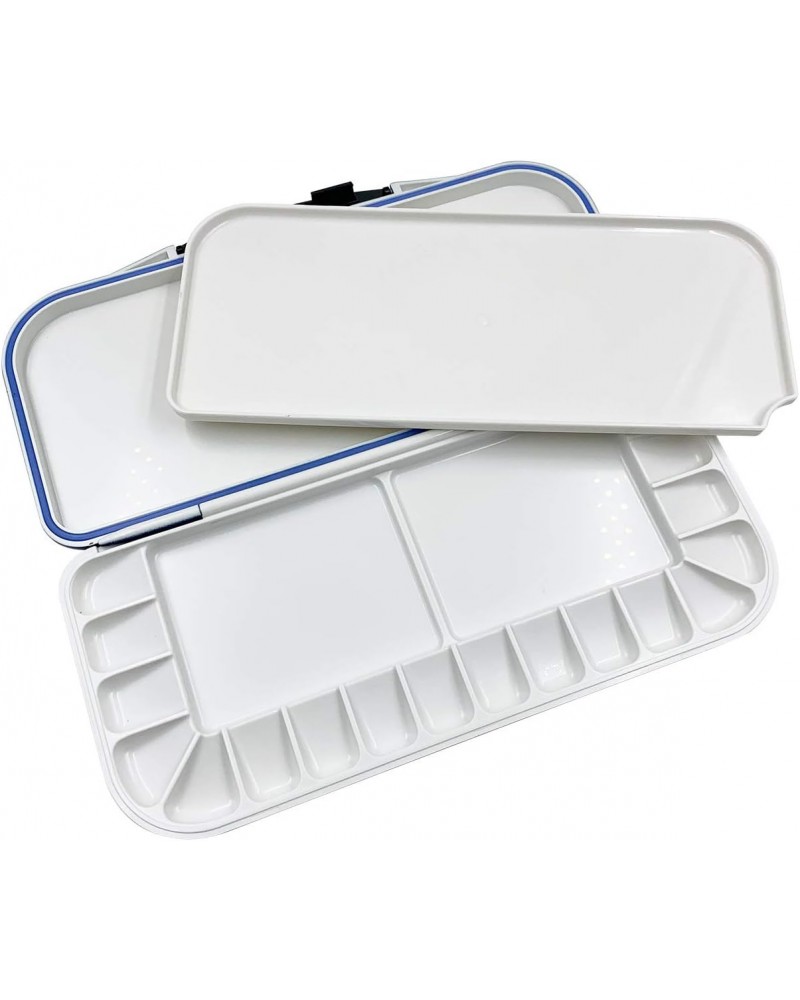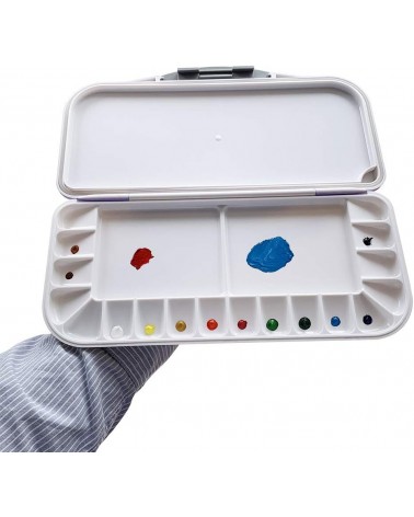 These compact and practical pallets are designed in a high-impact plastic. A hermetic closure makes it possible to keep perfectly your paintings in this "Box Palette". A great and durable pallet suitable for outdoor painting. This palette contain 18 deep wells & 1 fuly removable large tray. When closed inside is ample to hold a couple of extra small tubes of paint or short handled paint brushes. Acid free, odorless & safe, clean up easily.