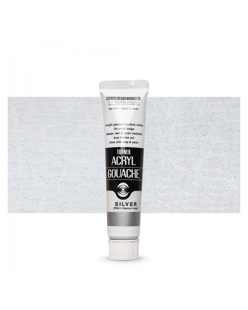 Turner Acryl Gouache is a highly-pigmented opaque paint which can be thinned with water but which dries quickly to a water-resistant, matte finish. Versatile it can be applied on many surfaces. This is a 20ml tube of Silver 72, one of nine metallic colours in the Acryl Gouache range.