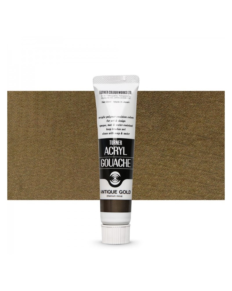 Turner Acryl Gouache is a highly-pigmented opaque paint which can be thinned with water but which dries quickly to a water-resistant, matte finish. Versatile it can be applied on many surfaces. This is a 20ml tube of Antique Gold 76, one of nine metallic colours in the Acryl Gouache range.