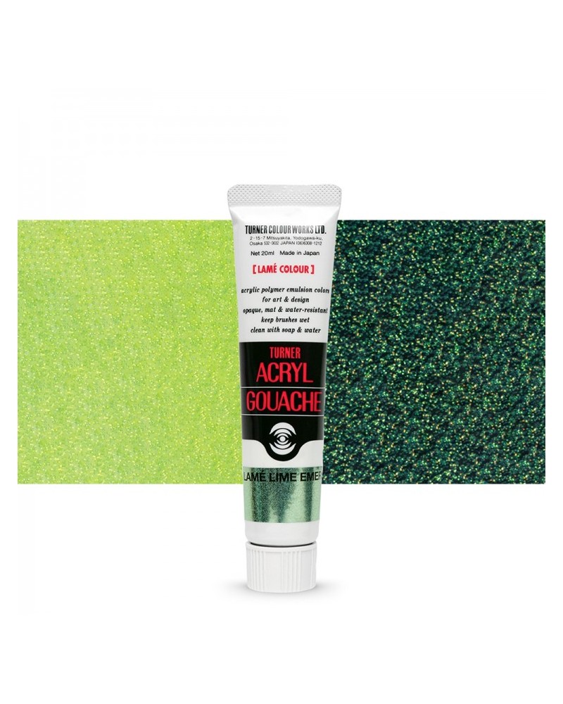 Turner Acryl Gouache is a highly-pigmented opaque paint which can be thinned with water but which dries quickly to a water-resistant, matte finish. Versatile it can be applied on many surfaces. This is a 20ml tube of Lame Lime Emerald 228, one of nine metallic colours in the Acryl Gouache range.