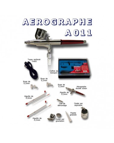 This dual action airbrush will allow you to adjust the volume by adjusting the needle stop and adjustable airflow by pressing the trigger. 2 buckets are available : the bucket by gravity closer to paint your room and suction cup to have a larger amount of paint when painting surface is greater. Graduated pipette allow you to take the precise amount of paint thinner or water you want to use. This box allows you to choose the formula that best suits your grip and work to achieve. 3 nozzles and needles ( 0.2 mm - 0.3 mm - 0.5 mm) interchangeable with the key removal , allow you to adjust the accuracy of your sprays and your tracks. The air hose reinforced braided canvas 1m80 offers a wide range for all your applications.