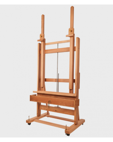 Full Size French Easel. Made of Oiled Beechwood, it offers the main features of the successful original JULLIAN French Easel. Metal lined interior drawer with adjustable dividers, brass plated fittings, varnished wooden palette, plastic moulded feet, natural linen shoulder strap. Supplied with a shoulder bag.