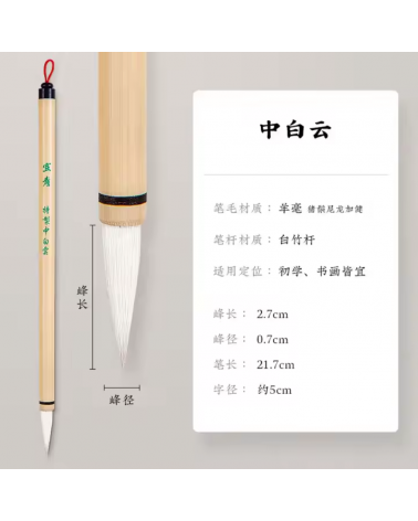 Perfect brush for class regular script calligraphy. The Medium size is a proper size to practice classic calligraphy of Yan ZhenQing, Liu GongQuan... This is also a proer brush size for beginners to practice on a 9x9cm size calligraphy square. The hair are in Goat + synthetic fibers (Thoses are less likely to split, which makes it simple to achieve fine lines, even blends ans stokes)