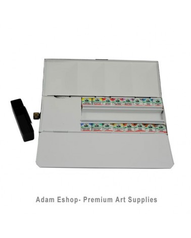 1 x Cadmium Yellow Lemon D9, 1 x Scheveningen Yellow Light B12, 1 x Red Light Cadmium E21, 1 x Alizarin Crimson Lake Extra C163, 1 x Old Holland Bright Purple C193, 1 x Payne's Gray B214, 1 x Indigo Extra B33, 1 x Manganese Blue C41, 1 x French Ultramarine Light Extra B37, 1 x Scheveningen Green Deep C49, 1 x Olive Green Dark B307, 1 x Yellow Ocher Light A53, 1 x Brunt Sienna A61, 1 x Brunt Umber A70, 1 x Sepia Extra A355, 1 x Ivory Black Extra A74.