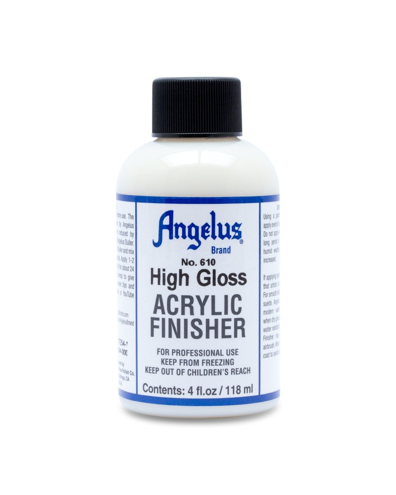 Finisher Angelus 600 4Oz (Normal) : Original Angelus Acrylic Finisher is used on all smooth leathers. It is excellent for hand crafted work or high speed production. Just apply with a sponge, rag, sheep's wool, or spray gun, and let dry. No buffing is needed. This water-based product cleans up with soap and water. When dry, the Acrylic Finisher is water-resistant, and will not rub off, crack, or streak. It is flexible enough for shoes, belts, handbags, luggage, saddlery, and tack equipment. It can also be used on gourds or anything needing a clear finish. Warning : Keep out of reach of children. Causes eye and skin irritation.