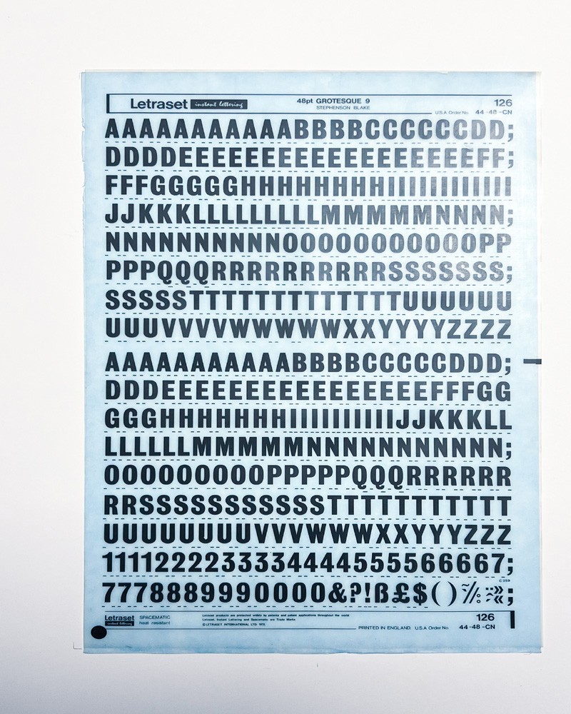 Letraset was a company known for manufacturing sheets of typefaces and other artwork elements using the dry-transfert lettering method. This dry rub down transfer technique was used by the punk movement because of its ease of manipulation and quality of the rendered layout. They could create designs independent from printers and publishers.