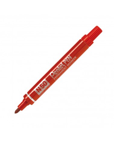 N50 Pentel rouge : Le Pentel N50 Marker est a marqueur à alcool a pointe ogive inventée dans les années 60. Idéal pour de multiples usages. Corps en alluminium, solide. Ecrit sur la plupart des surfaces. Largeur de la pointe : 2mm.  L'encre du maqueur N50 est principalement à base d'alcool, celui est aussi le principal solvant dans lequel la couleur est diluée. L' encre forme un film insoluble à la surface. La forte adhérance qui est obtenue sur les surfaces lisses constituées de matériaux non absorbants est due à un ajout de résines. Les composants alcooliques de l'encre, les solvants s'évaporent rapidement, permettant ainsi qu' un film se forme à la surface. Un grand classique pour les nostagiques de l'odeur des marqueurs à solvents.
