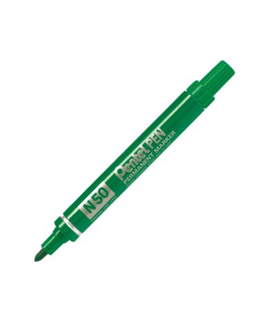 N50 Pentel vert : Le Pentel N50 Marker est a marqueur à alcool a pointe ogive inventée dans les années 60. Idéal pour de multiples usages. Corps en alluminium, solide. Ecrit sur la plupart des surfaces. Largeur de la pointe : 2mm.  L'encre du maqueur N50 est principalement à base d'alcool, celui est aussi le principal solvant dans lequel la couleur est diluée. L' encre forme un film insoluble à la surface. La forte adhérance qui est obtenue sur les surfaces lisses constituées de matériaux non absorbants est due à un ajout de résines. Les composants alcooliques de l'encre, les solvants s'évaporent rapidement, permettant ainsi qu' un film se forme à la surface. Un grand classique pour les nostagiques de l'odeur des marqueurs à solvents.