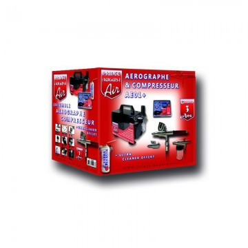 Conjunto Aerógrafo A011 + Compresor AE01 Prince August : En este estuche encontrará el aerógrafo de doble acción Prince August A011. Aerógrafo "todo terreno", está provisto de tres boquillas y de tres agujas de 0,2 mm, 0,3 mm y 0,5 mm y de dos tipos de botellas, una botella por gravitación, de 5 ml y una botella de 22 ml, para pintar grandes superficies sin recargar la pintura. En este estuche encontrará también el compresor AC01 de pistón, seco y sin aceite, con arranque y parada automática, provisto de un manómetro para controlar la presión de aire, un filtro de aire y una purga, que facilitarán la evacuación de la humedad. El tubo de aire reforzado de 1,80 m , de funda trenzada, le ofrecerá, gracias a su talla y a su flexibilidad, un confort de trabajo incomparable. El Ultra Cleaner UC01 incluido en este estuche le permite decapar hasta las zonas más inaccesibles de su aerógrafo.