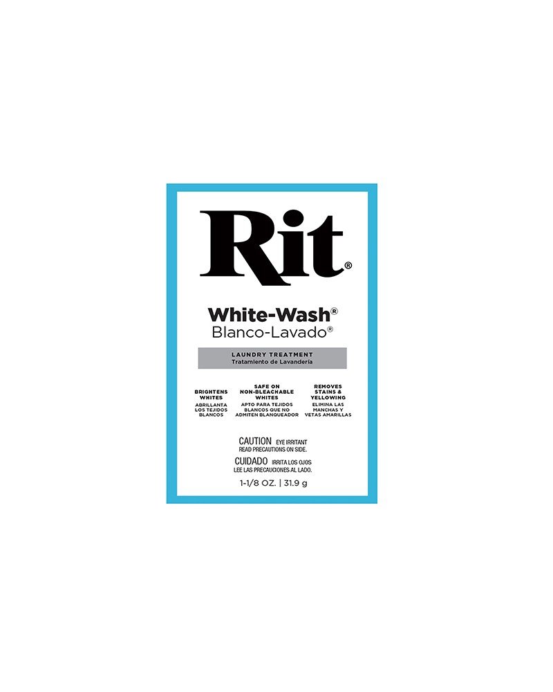 Una combinación de blanqueador y abrillantador sin cloro, diseñada para dar brillo a las telas blancas sucias, además de eliminar el amarillamiento y la decoloración. Elimina manchas, como hierba, grasa y lápiz labial, solo en telas blancas. - Debido a que Rit White-Wash no contiene cloro, se puede usar en artículos delicados y no blanqueables, como lencería y seda