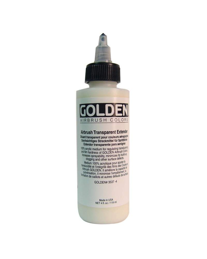 AIRBRUSH TRANSPARENT EXTENDER - Diluant transparent pour couleurs aérographes : ce diluant pour couleurs aéro est conçu pour accroître la transparence et l'adhérence des couleurs pour aérographe GOLDEN. Existe en 30 et 119 ml.