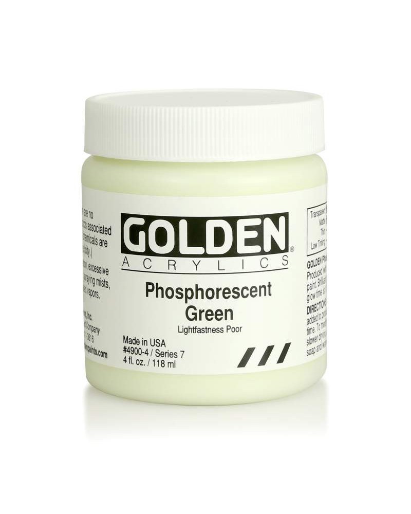 Gel MEDIUM PHOSPHORESCENT : ce produit unique en son genre a la propriété d'absorber et de restituer les rayons ultra-violets d'une source de lumière. Les supports peints avec ce médium restituent dans l'obscurité la lumière qu'ils auront absorbée. Existe en 119, 237 et 473 ml.