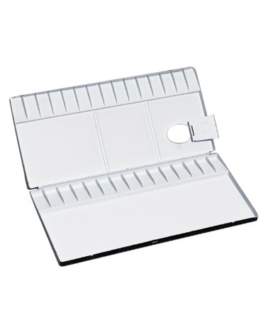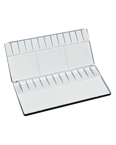 Palette aluminium émaillé pliante Holbein N.20 : Nous vous proposons en exclusivité les magnifiques palettes émaillées de chez Holbein. La palette N.20 possède 39 séparations pour placer les couleurs et 4 espaces afin d'effectuer vos mélanges. Une superbe finition noir laqué à l'extérieur ainsi qu'un blanc émaillé pour l'intérieur. Taille palette fermé : 20,50x8.50x1,9cm Poids : 160gr