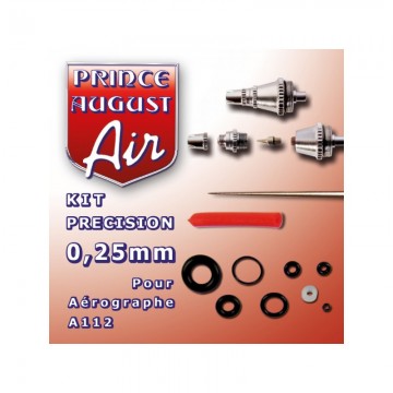 Kit de précision 0.2mm pour Aérographe A112 Prince August : Aiguille et buse de 0,2mm pour Aérographe Prince-August A112. Dans ce kit vous trouverez : Une aiguille de 0,2mm. Une tête complète de 0,2mm (protège aiguille en couronne, tête d’air, buse et corps de tête d’air). Neuf joints.