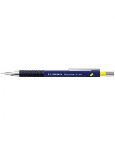 porte-mines 0,3mm Staedtler Mars Micro : Porte-mine de dessin et d'écriture avec manchon caoutchouc antiglisse, pointe, clip et poussoir métal. Le canon est droit pour les tracés à la règle et rentrant pour la protection des poches. Le Staedtler Mars Micro est doté d'un amortisseur de mine et d'un système de recharge directe de 12 mines. Disponible en 4 diamètre de mines (0.3, 0.5, 0.7 et 0.9mm)