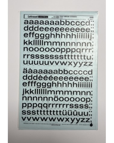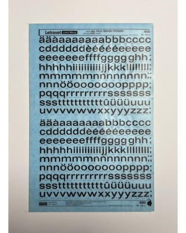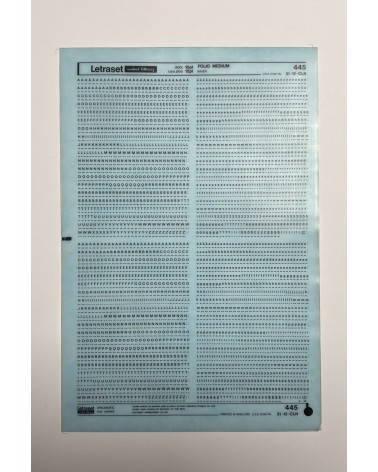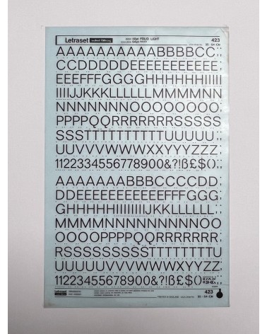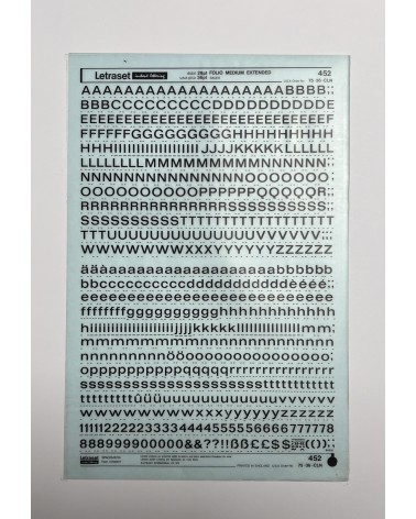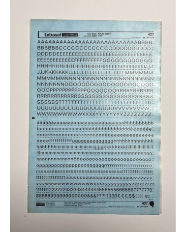 Letraset 421 - FOLIO LIGHT - 60pt : Feuilles en plastique sur lesquelles sont surimprimés des lettres et des symboles que l'on peut décalquer. Utilisées, entre autres, par les créateurs de fanzines, et les punks en raison de leur facilité d'utilisation et d'un excellent rendu graphique s'affranchissant ainsi de l'imprimerie industrielle.