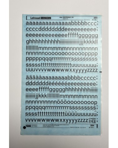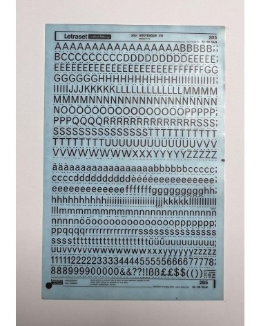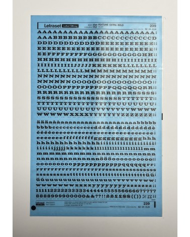 Letraset 239 - FORTUNE EXTRA BOLD 20/24pt : Feuilles en plastique sur lesquelles sont surimprimés des lettres et des symboles que l'on peut décalquer. Utilisées, entre autres, par les créateurs de fanzines, et les punks en raison de leur facilité d'utilisation et d'un excellent rendu graphique s'affranchissant ainsi de l'imprimerie industrielle.