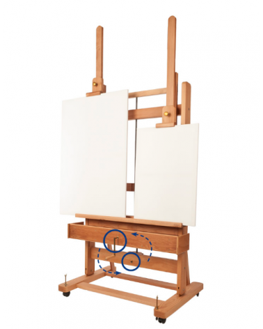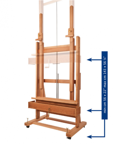 Hêtre évaporé huilé. Élévation par manivelle. Double tiges centrale allongeable pour utiliser des toiles atteignant 235 cm de haut. Vis arrières d’arrêt des tige pour le blocage du châssis. Poids : 45 kg. Livré en kit. Pour maximum 40kg. Deux tiroirs porte-objets, roues et vis de blocage.
