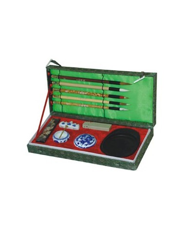 Coffret en brocard et velours haut de gamme avec pierre à broyer, bâtonnet d'encre, pinceaux bambou, pierre de jade, tampon, godets porcelaine.