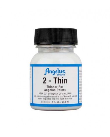 Angelus 2 thin 29.5ml : Angelus 2-Thin est utilisé pour diluer la peinture pour le cuir angelus. Le diluant 2-thin pemet d'utiliser la peinture Angelus pour le cuir avec un aérographe. Egalement pratique lorsque l'on peint sur une surface tissée, la peinture peut ainsi mieux pénétrer au coeur des fibres. Fonctionne avec toute la gamme de peinture Angelus, même les Glitters. Avertissement : Tenir hors de portée des enfants. Peut provoquer une irritation des yeux et de la peau. Pour les utilisateurs d'aérographe il est recommandé de diluer à 50% la peinture Angelus à l'aide de 2-Thin, et en ajoutant un peu de Flow Improver (disponible sur notre site). Pour les utilisateurs de marqueurs, quelques gouttent suffisent.