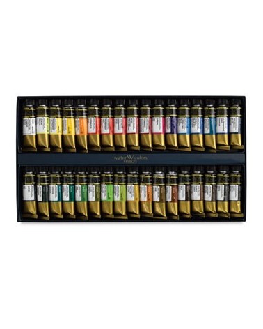 Set avec 34 couleurs en 15ml : Lemon Yellow, Permanent Yellow Light, Permanent Yellow Deep, Yellow Orange, Vermilion, Permanent Red, Permanent Rose, Rose Madder, Permanent Alizarin Crimson, Opera, Yellow Ochre No. 1 Transparent, Raw Sienna, Raw Umber, Burnt Sienna, Red Brown, Burnt Umber, Vandyke Brown, Sepia, Greenish Yellow, Yellow Green, Sap Green, Viridian, Olive Green, Hooker''s Green, Vandyke Green, Cerulean Blue, Peacock Blue, Cobalt Blue No. 1, Prussian Blue, Indigo, Ultramarine Deep, Permanent Violet, Ivory Black, and Chinese White Transparent.