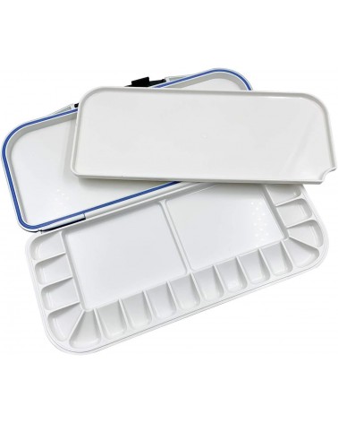 Magnifique palettes compacte pour l'aquarelle concu dans un plastique très solide. Une fermeture hermétique permet de conserver parfaitement vos couleurs. Une pallete adaptée pour peindre en extérieur qui contient 18 trous et deux espaces au centre pour mélanger vos couleurs. L'espace est assez profond pour y placer des pinceaux à manche court et quelques tubes. Le plus de cette palette, un plateau amovible si les deux espaces ne sont pas assez grands pour vos mélanges. Une fois enlevé il est également facile de le nettoyer.