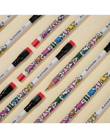 Le crayon Palomino Blackwing 292 est une édition limité en hommage a Keith Haring un des artistes les plus emblématiques de la scène artistique des années 1980. Il a marqué l'histoire du street art et du pop art grâce à son style unique et immédiatement reconnaissable. Sur chaque crayon vous retrouverez les fameux personnages entourées de noir et remplis de couleurs vives (Jaune, Rose, Vert, Bleu)