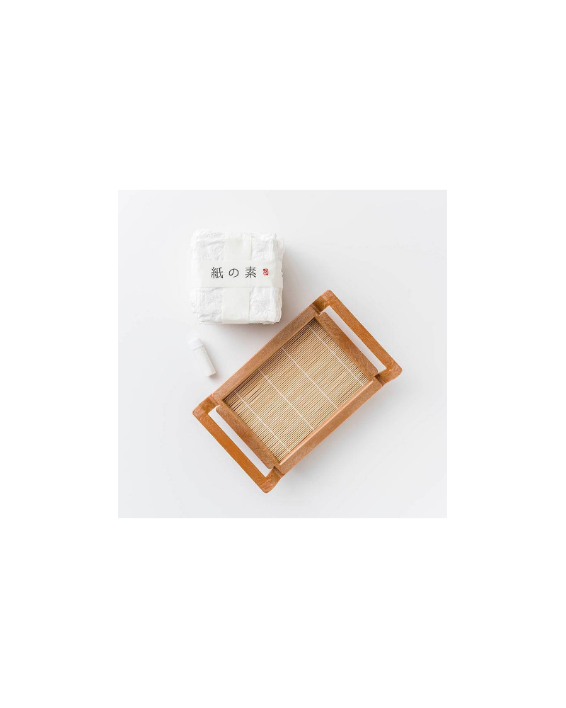 Un cadre à papier en plastique (Keta) avec un tapis en bambou (Su) + de la pulpe de Kozo comprimée pouvant être réumidifiée pour la fabrication du papier. Notice en anglais inclue dans le coffret.