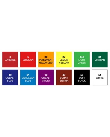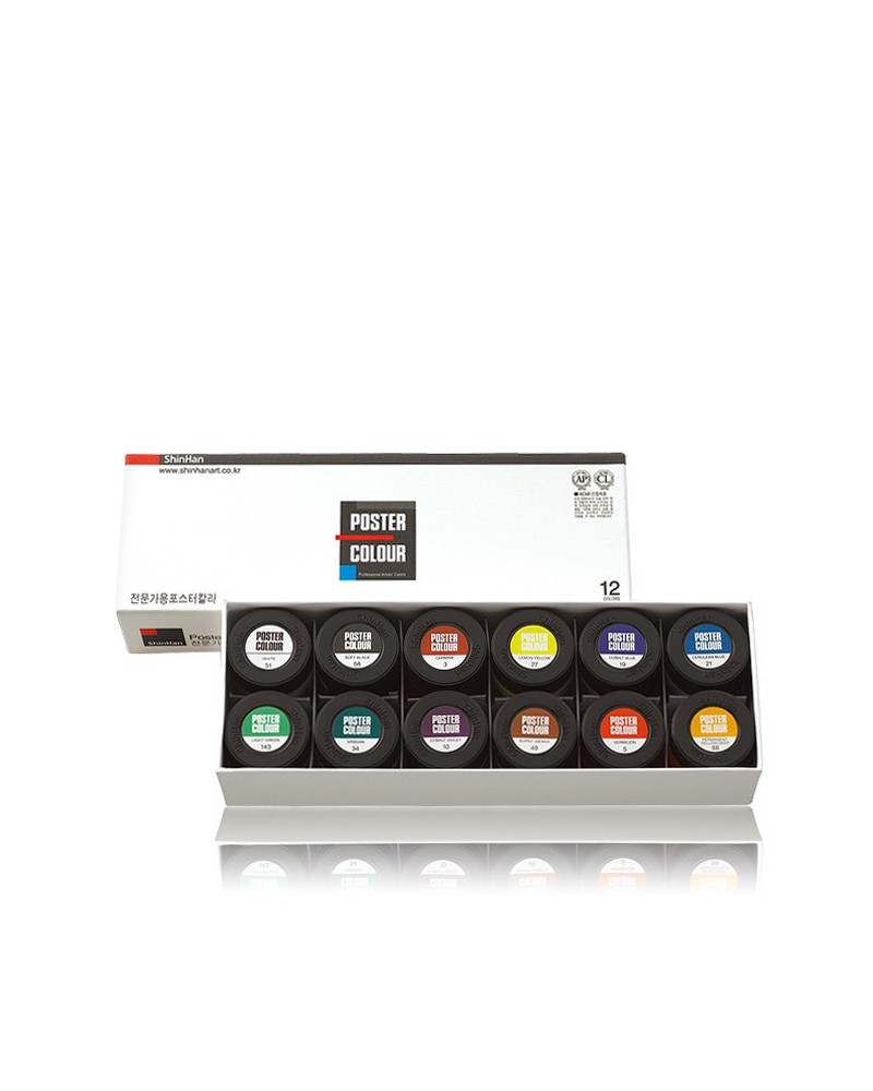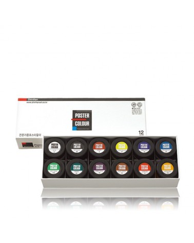 Boite contenant 12 couleurs de poster color extra-fine Shinhan en flacon de 40ml. Conditionée dans des flacons en verre pour plus de stabilité, cette gouache offre des couleurs vives en opaque. Beaucoup de professionnels en Asie et aux Etats Unis les apprecient pour leur excellente capacité a se mélanger entre elles offrant ainsi une infinité de nuances sans alterer l'intensité des couleurs.