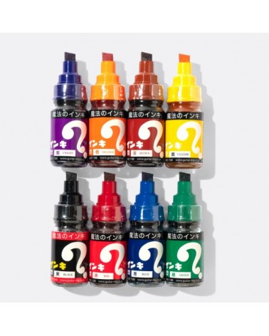 Superbe boite contenant 8 feutres en flacon verre magik ink. Un cadeau pour vos amis passionnés par les arts Graphiques au Japon ou pour les nostalgiques des feutres magik markers.Développé au japon et mis sur le marché en 1953 par la marque Teranishi ce marqueur combine les avantage de l'huile (très permanent) et de l'alcool (séchage rapide). Le corps du feutre est en verre avec une pointe biseau. Fonctionne sur de nombreuses surface tel que le verre, métal, plastique, cuir, bois, ceramique et même la glace ! Rechargeable et pointes interchangeables. Récompensé en 2008 par le "Good design award Japan" pour son nouveau packaging.