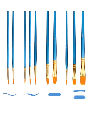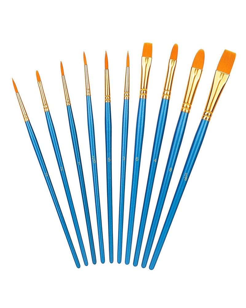 Notre meilleure offre pour peindre avec toute technique : Aquarelle, Acrylique, Vinylique, Huile, Gouache... Adapté a tout niveau. Ce lot comprend 10 pinceaux de 10 tailles et 4 formes différentes. Pointe ronde, usée bombé, plat et pointu. Leur manche court est en bois laqué et lisse en couleur Pale blue pour un meilleur contrôle du pinceau. Poils en PBT, doux, solide et faciles a nettoyer pour une utilisation fréquente.